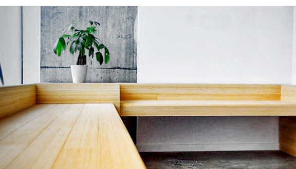 douces. Les meubles se jouent des matières, bois, mosaïques et béton se